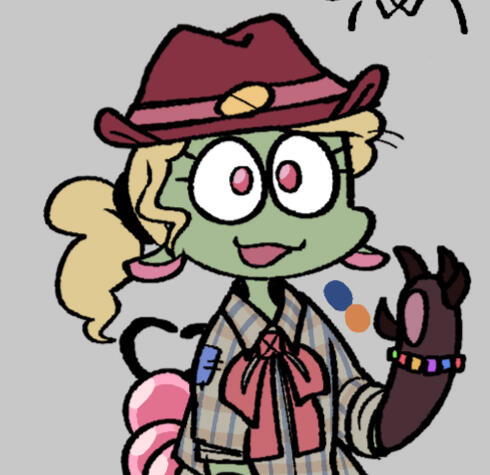 Pixie is a fairy from the same fairytale forest Grem was living in when he ran away from home. Like Grem she also ran away from home due to pressure from her family but was not allowed to return after she realized she wasn't ready to be on her own, since she was now seen as a traitor and ruined her family's reputation. She's selectively mute and has only ever spoken around Griff because he's her bestie. Pixie feeds off of trauma and bad memories and is NOT normal about it. She has a cutesy and innocent demeanor but is actually suuuuper fucked up in the head.